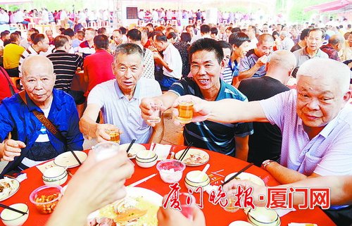 品尝美味佳肴,畅谈幸福生活。 厦门晚报讯(文/记者 陈满意 通讯员 许晓霞 图/刘东华)昨天是重阳节,当天,来自后溪镇后垵、崎沟、东宅三个村原属“珩山大队”的947位阿公,聚在一起享受“千叟宴”。今天,将有1214位60岁以上的妇女参加“千妪宴”。 根据圣菓院内石碑记载,从1549年开始,珩山王氏就有在重阳节当天以“全牲祭祀始祖”的风俗,一直延续至今。每年,珩山王氏的后人们都会自发捐献钱财,组织一场规模盛大的敬老活动。今年,是珩山王氏连续举办“千叟宴”敬老活动的第八个年头。从2012年开始,60岁以上的妇女们也当起了主角,自此有了“千妪宴”。 开席前,现场举行了首届珩山重阳文化座谈会,与会的除了赴宴老人,还邀请厦门王氏宗亲的代表参与其中。“接下来,我们计划推选出各村敬老爱老模范家庭,同时推选出保家卫国、教子有方等代表,树立典型,给予奖励。”珩山华侨联谊会秘书长王合友表示,与会人员都赞成提倡孝文化,把珩山孝文化传播出去。 宴席开始时,舞台上,老中小三代人轮流登场表演节目,给参宴的老人们助兴;舞台下,上百桌菜品摆上桌,老人们围坐一起,共品美味佳肴,畅谈幸福岁月。场面宏大,气氛温馨。 现场还为高龄老人、钻石婚、金婚老人颁发了慰问金。据统计,珩山王氏90岁以上的老人有50位,其中包括三位百岁老人。钻石婚(结婚60年及以上)老人有3对,金婚(结婚50年及以上)老人有28对。 主办方表示,希望通过这种为老人过节的方式,向社会传播尊老、敬老、爱老、助老的良好风气,也向大家宣传“白头偕老”的榜样。 |