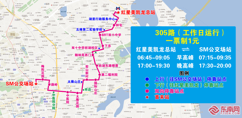 调整435路为305路,方便枋湖东路、金山西路片区乘客接驳地铁2号线五缘湾站 305路停靠站点上行经红星美凯龙总站、湖里行政服务中心、钟宅、五缘第二实验学校、BRT双十中学、下忠、双十中学枋湖校区、翰林苑西门、枋湖东路穆厝、第二福利院、国际山庄、宏山新村、太薇山庄、太薇花园、中医院、薛岭、梅阳花园、SM公交场站;下行停靠SM公交场站、梅阳花园、薛岭、中医院分院、中医院、太薇花园、祥店、宏山新村、国际山庄、第二福利院、枋湖东路穆厝、翰林苑西门、双十中学枋湖校区、下忠、BRT双十中学、钟宅、红星美凯龙总站。 工作日运行时段为红星美凯龙总站早高峰 6:45-9:05,晚高峰 17:00-19:30;SM公交场站早高峰 7:15-9:35,晚高峰 17:30-20:00。 |