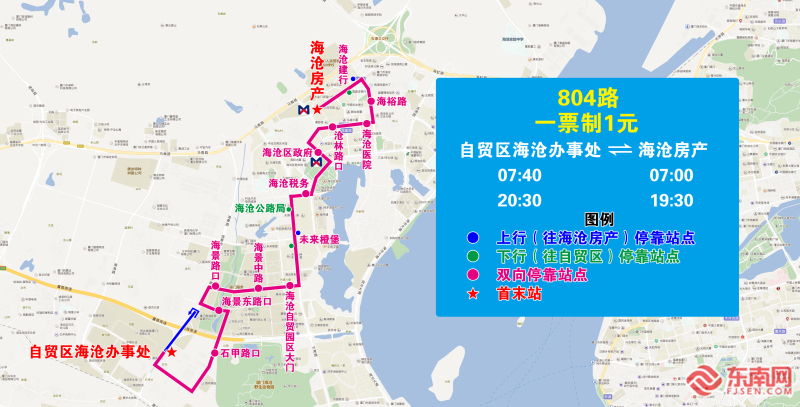 新增804路,方便海沧自贸区、未来橙堡、海沧生活区等片区乘客接驳地铁2号线海沧行政中心站、马青路站。 该线路往返于自贸区海沧办事处—海沧房产。上行由自贸区海沧办事处始发,经海景路(海景路高架桥下调头区调头)、保税路、石甲路、海景东路、海景南路、海景路、海景中路、兴港路、滨湖北路、海林路、钟林路、沧林路、海裕路、沧虹路至海沧房产;下行由海沧房产始发,经沧虹路、海裕路、沧林路、钟林路、海林路、滨湖北路、兴港路、海景中路、海景路、海景南路、海景东路、石甲路、保税路、海景路至自贸区海沧办事处。 804路公交车计划发班间隔为18分钟一班。自贸区海沧办事处首班 7:40发车,末班发车时间为20:30;海沧房产首班 7:00,末班发车时间为19:30。 |
