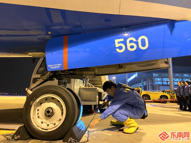 2019年12月31日23时50分许,厦航地勤工作人员正在对刚停靠机位的飞机例行检查和相关维护。 东南网记者 颜财斌 摄