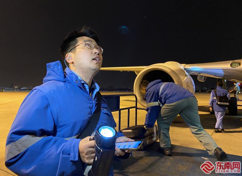 2019年12月31日23时50分许,厦航地勤工作人员正在对刚停靠机位的飞机例行检查和相关维护。 东南网记者 颜财斌 摄