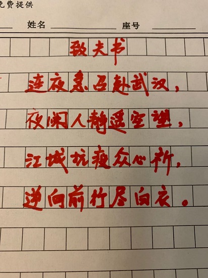 周峻荔写给丈夫朱其国的诗。(厦门市儿童医院供图) “今天是你去武汉的第五天,我很想念你” 35岁的朱其国是厦门市儿童医院呼吸内科的医生,作为入党积极分子的他早在第一批征集时就报名了,平时已做好各项准备,包括家庭、业务、防护上,接到通知马上准备生活用品就能出发。 朱其国的妻子周峻荔也是厦门市儿童医院医院的医生,朱其国去武汉,她守在厦门,除了工作还得照顾家里年近七旬的母亲和两岁的女儿。出发当天,周峻荔给朱其国理了头发,煮了白水蛋带上,希望丈夫平安归来。朱其国来不及吃,贴身放在兜里。情人节来临,周峻荔写下告夫书,希望朱其国和战友们早日凯旋。 |