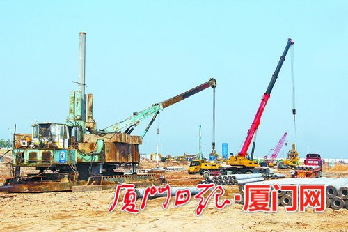 高崎污水处理厂一期工程现场,起吊机、打桩机等大型机械在作业。