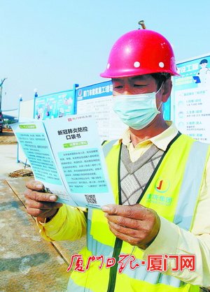 工人学习市政集团印发的新冠肺炎防控材料。 厦门日报讯(全媒体记者 吴海奎 通讯员 李 力)从暂停键,到播放键,再到快进键,连日来,厦门市政集团按照市委市政府“既要确保打赢疫情防控阻击战,又要坚决打赢经济发展攻坚战”的部署要求,牢记国企使命担当,咬定全年目标任务不动摇,以高度的责任感和紧迫感,全力支持和推动集团各下属单位在建项目早复工、早提速。近日,在前埔污水处理厂三期(扩建)、高崎污水处理厂、美山路地下综合管廊、东部垃圾焚烧发电厂二期、滨海东大道等一批事关民生、事关发展的市政工程工地上,人员、物资投入等不断加大,已经呈现出热火朝天的施工场面。 |