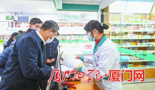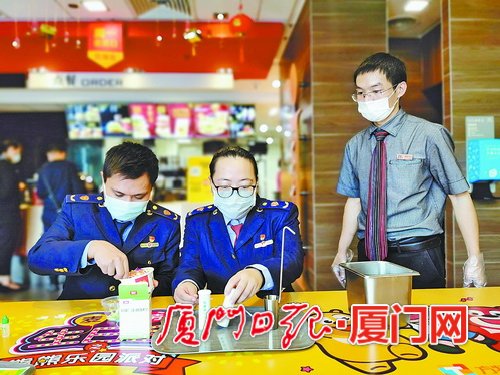 监管人员对餐饮店制售的食品开展快检。 解忧难 当好百姓群众的“勤务兵” 市场监管责任重大,不仅要巡查市场、处理投诉,还要纾民困、解民忧,当好百姓的“勤务兵”。针对疫情防控期间线上配送需求增大的情况,湖里区市场监督管理局重点对生鲜配送行业、集体用餐配送单位和线上餐饮服务第三方平台开展检查和指导,要求经营者加强对员工尤其是外送人员的体温监测和健康管理,落实佩戴口罩等个人防护措施,加大配送容器、车辆等清洗消毒频次,实施食品封签配送,为消费者提供非接触式的配送服务,通过抓好人员防控、追溯体系防控、场所环境防控、食品安全风险点防控,切实保障人民生命健康安全。 政府指定的武汉返厦人员定点接待酒店——舫阳酒店位于禾山市场监管所辖区,该所对酒店人员是否落实晨检防护,餐厅后厨是否生熟区分、专间专用,餐前消毒是否到位等都严抓细管,确保武汉返厦人员的用餐安全。在厦门市中医院,江头市场监管所的监管人员采取食材进货“必查验”、从业人员“必测温”、清洁消毒“必记录”、供餐流程“必严控”的“四必”措施监管该医院食堂,守护白衣战士的健康。1月28日,当得知辖区内一口罩生产企业因人员紧缺,产能难以提升的困难,殿前市场监管所立即安排5位工作人员利用非工作时段到该企业协助包装口罩,为防疫物资供应助力。为保障复工复产,湖里区市场监督管理局主动作为,帮助农贸市场经营户、餐饮配送等企业、个体户解决口罩91030个,消毒液1000斤,并帮助辖区内经营户免费校准额温枪,切实将防控举措落实到位。 为发挥零售药店网络覆盖优势和早期监测作用,湖里区局迅速组织辖区零售药店启用购买退烧止咳药品人员信息采集系统,对购买人进行实名登记、体温测量,实施全面排查,对涉及湖北疫区的购药人员,确认身份后立即报告市卫健委,有效控制传染源。截至目前,共采集购买解热镇痛及止咳药品人员信息18314条。同时,市场监管人员还督促药店做好进店人员体温监测,如发现有体温偏高等情况,第一时间上报。