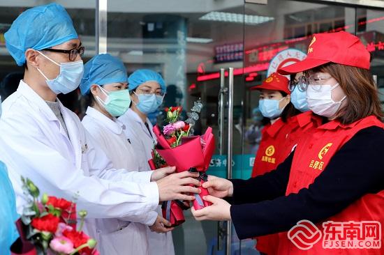 江头街道吕厝社区学雷锋志愿者为社区卫生服务中心医护人员送上鲜花。(吕厝社区供图)
