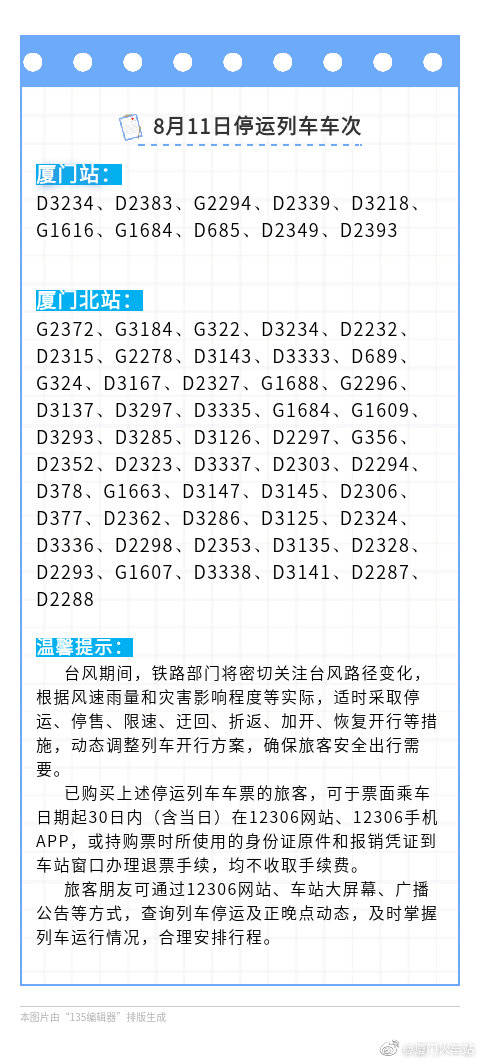 东南网8月11日讯(本网记者 卢超颖)8月11日上午7时30分,今年第6号台风“米克拉”的中心在福建漳浦沿海登陆,登陆时中心附近最大风力12级( 33米/秒,台风级),中心最低气压980百帕。记者从厦门火车站获悉,受台风“米克拉”影响,8月11日厦门站、厦门北站部分列车停运。 厦门火车站提醒,已购买停运列车车票的旅客,可于票面乘车日期起30日内(含当日)在12306网站、12306手机APP,或持购票时所使用的身份证原件和报销凭证到车站窗口办理退票手续,均不收取手续费。 8月11日厦门站、厦门北站以下列车停运: