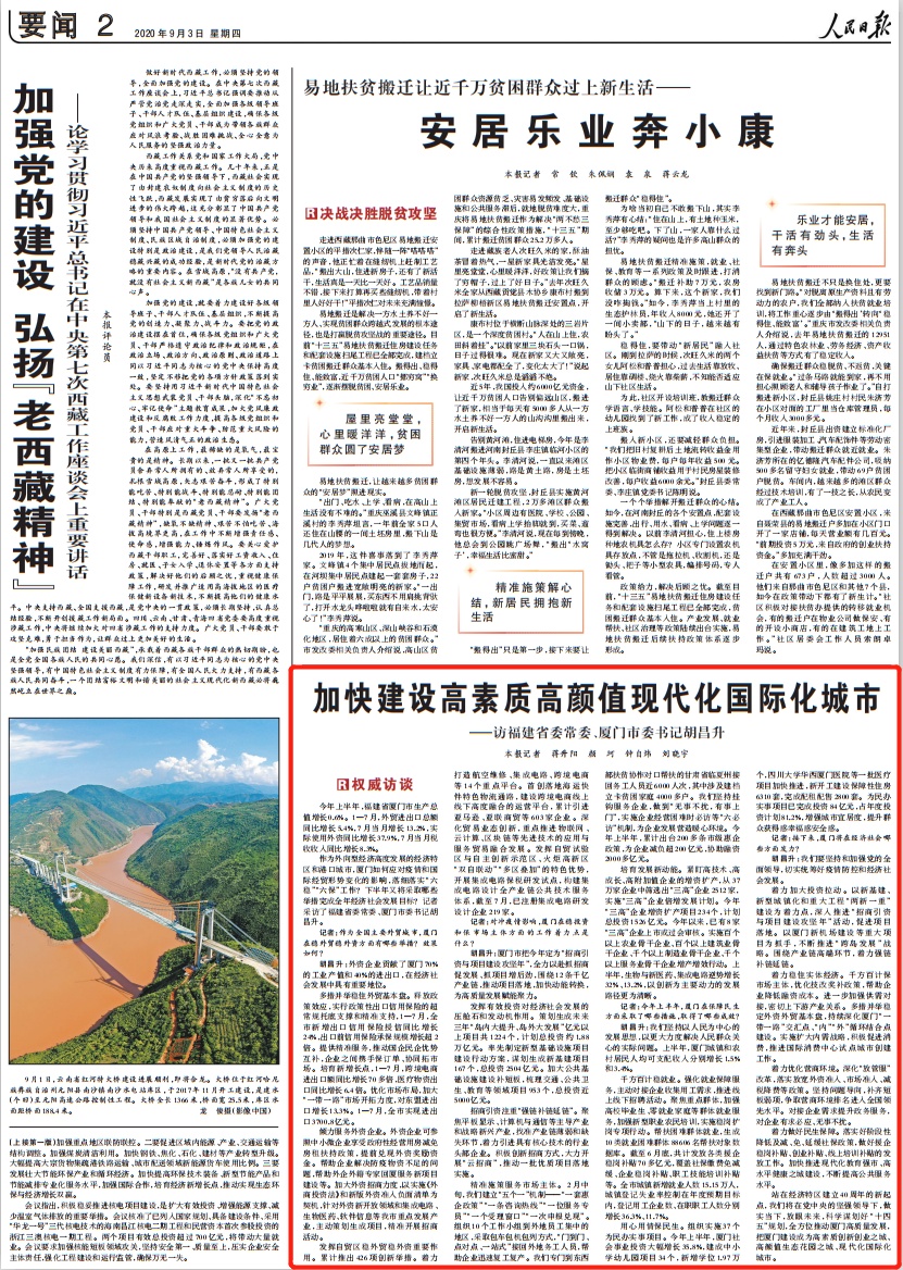 9月3日,《人民日报》要闻版“权威访谈”栏目刊发人民日报记者专访福建省委常委、厦门市委书记胡昌升《加快建设高素质高颜值现代化国际化城市》。