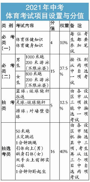 厦门日报讯(记者 佘峥) 明年中考体育方案定了!要笔试,还要抽考! 省教育厅昨天下午对外发布《福建省初中毕业升学体育与健康考试实施方案(试行)》,具体内容为: 一、明年中考体育满分为40分,比现行中考方案多了10分,当然,明年中考总分也从今年的655分提高到800分。 二、中考体育要笔试,即40分构成是:体育与健康基本知识占4 分,身体素质与运动技能占36分。“体育与健康基本知识”就是笔试。 三、体育笔试与《道德与法治》科目同场合卷进行,单独一个模块,考试时间合计为100分钟,即原《道德与法治》考试时间为90分钟,增加《体育与健康基本知识》考试时间10分钟。 四、体育笔试共设16小题,每小题0.25分,全部为单项选择题。体育笔试考试内容:以《义务教育体育与健康课程标准(2011年版)》第三部分课程内容中的水平四(7-9年级)、《福建省义务教育“体育与健康”教学指导意见(试行)》水平四中的“体育与健康知识内容和标准”作为基本内容。 五、抽考类、抽选考类由省教育厅委托各地市教育局随机抽选,并于当学年(上学期)11月份抽取并向考生公布初中毕业生体育考试项目。体育中考的身体素质和运动技能在当学年(下学期)4月上旬至5 月中旬之间完成。 省教育厅昨天也公布明年中考体育各个项目的标准。本报教育类微信公众号“厦门招考”今天有详细解读。 |
