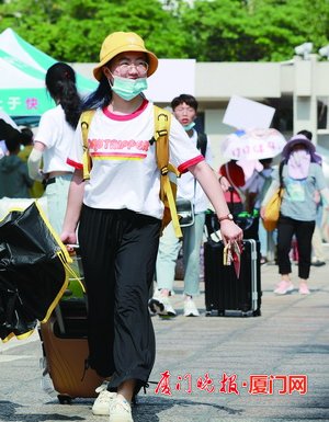 新生充满朝气。 在新生报到点旁边的拍照点,厦门大学外文学院宣传中心采编部门的两名女生各自架着一台专业相机,为每一名新生拍照留念。 厦门晚报讯(文/记者 龚小莞 图/陈立新)今天是厦门大学新生报到的首日,记者了解到,出于疫情防控的需要,今年不允许家长陪同进校。往年新生报到只有一天,今年改为两天,今天有5149名本科生报到,明天为研究生报到。厦大方面也安排了更多的学生志愿者,为新生提供热情周到的服务。 报到之前先加新生群 未见面已“认识” 人文学院新生刘逍航来自山东泰安,她带了一大堆的行李,床垫、被褥、蚊帐等都是在家里买好后提前快递过来的。她说,担心厦门这边的气候比较潮湿,所以买了乳胶床垫。褥子是自己定做的,被子、毛巾被等是网购。她事先向学姐打听到宿舍床铺的尺寸,然后根据尺寸定制或者购买。这样时间比较充裕,以免到厦门后太匆忙,买不到合适的。 学院之前建了一个本科生群,在群里发布分班和分宿舍的结果,学生可以从群里搜索到自己的舍友。刘逍航说,她们宿舍的人都互加了微信,算是提前“认识”了。9月8日来到厦门后,她联系了来自河北的舍友马骁骕。两人住的酒店离得很近,就约个时间见面聊了一会儿。今天她们相约一起到学校报到,可以互相帮忙提行李等。 每年都有拍照仪式 激励学生不负青春不负期望
