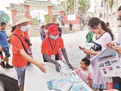 志愿者在鼓浪屿对游客进行文明旅游宣传。