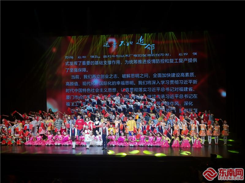 大型情景剧《远亲不如近邻》在厦门公演。东南网记者 卢超颖 摄 东南网10月30日讯(本网记者 卢超颖 李奇)28日晚,由厦门市思明区策划的大型情景剧《远亲不如近邻》在厦门闽南大戏院正式公演。一幕幕感人的暖心故事让广大观众为之动容。 情景剧《远亲不如近邻》以弘扬“远亲不如近邻”文化为创作理念,以思明区委“近邻”主题系列文章为蓝本,以思明区战疫故事进行脚本创作,致力讲好“近邻”故事和思明故事,弘扬“远亲不如近邻”的文化,推进“爱心厦门”五大行动,共同构筑大爱之城。 该剧讲述了以社区书记、社区沙茶面店阿福夫妇、驰援武汉医生张晓燕一家人、外国人博斯、琳娜和李老师等为代表的基层普通人物的故事。临危不惧、互帮互助,抒写了“远亲不如近邻”守望相助的感人暖心故事。在表演方式上,该情景剧融合了舞台表演、舞蹈、合唱等多种艺术形式,汇聚了思明区文艺界诸多专业演员,总参演人数达150人,为市民奉上了一场感人至深的舞台盛宴。