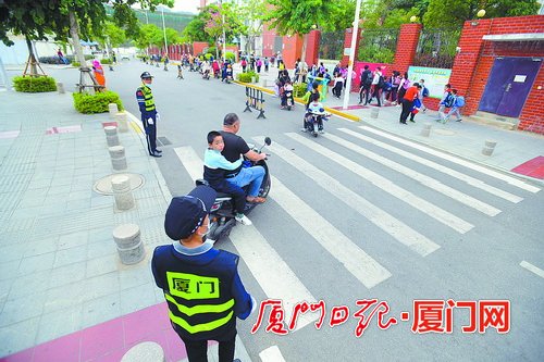 厦门五中门口接送学生车辆占用公交专用道。(记者 赵张昀 摄) 仍有不足之地 需进一步加强安全督导 尽管学校和有关部门已经针对校园周边交通情况,制定针对性措施并做出了各种尝试和努力,交警也在上下学高峰期积极护学、疏导交通,维护校园周边安全。但仍有一些不足之处:最为常见的便是学校附近路段的非机动车逆行、超载问题;其次是因道路狭窄,未能设置人行道,导致行人、非机动车和机动车混行的情况。另外,还有接送学的家长占道、违规等问题,需要进一步加强安全督导。 道路狭窄人车混行 学生家长小心翼翼 10月26日下午4点,暗访团来到位于万寿路的思明第二实验小学附近。校门前为双向两车道,并且是一段陡坡,人、车的交通条件不如大部分学校路段开阔。彼时正值放学时段,交警都已到岗执勤,校门口也聚集了不少等候的家长,部分将电动车停放在校门口一侧的机动车道上,使道路更显拥挤。4点30分,学生陆续走出校门,交通问题也愈加明显:由于道路较窄,加上校门口设有公交车站,高峰期便出现了接送学生的私家车、电动车混行,不时还有公交车路过,使道路更加拥挤。步行接送学生的家长们,带着孩子走在车道最右侧,小心避让着过路车辆。不少家长都表示,尽管每天都有交警等执勤人员到岗护学,但每天回家路上还是需要特别小心,一路上必须看好、牵住孩子。 接送车等在校门口 占用公交车专用道 厦门五中位于莲前西路,下午4点半左右,有私家车无视黄线禁停区域,停放在校园正门口的斑马线上。5点半,莲前西路上的人群和机动车辆逐渐增多,学校也逐渐进入放学高峰期。暗访团观察到,校门口有近10辆私家车沿路排队等待。同时,由于道路最右侧设有公交车专用道,车辆挤占了一半的专用道路面。有部分私家车在停靠、驶离的过程中,并未特别注意避让公交车,险象频频。 校门外难寻禁停标识 占用消防通道停车 在康乐二小周边走访时,暗访团注意到,校门外随处可见各类文明公益宣传,但“禁止车辆停靠”等交通安全标识却一处难寻。在不见警示提醒的情况下,时有车辆停在校门前,如出现车流高峰,便成了其他车辆的阻碍。 在金林湾实验学校门口,也发生了类似的情况:虽设有禁停标识,不少家长仍将车辆停放在校门口,甚至直接停放在消防通道上,将“消防车道 禁止停放”八个字碾压在车轮下。 非机动车超载逆行 交通安全意识欠缺 除了硬件设施的问题,暗访团在走访过程中发现,部分市民的交通安全意识仍有待提高。10月27日下午4点30分,梧村小学校门口,行人、电动车和机动车混行、逆行现象严重,因学校靠近主干道,大量接送学的非机动车行驶在机动车道上。 在康乐二小附近,不少电动车在途经学校附近路段并未减速,且逆行、超载。个别家长还在电动车前的踏板上安装了座位,前后各载一名儿童,在车流中穿行。 【声音】 家长说 建议改成单行道 接送孩子更安心 思明第二实验小学学生家长张女士:我们家离学校不算太远,每天都是步行接送孩子上下学。万寿路本来就是比较窄的双向车道,一路上有来往的私家车、公交车,还有不少电动车乱窜,我们只能尽量靠道路的最右边走。即便如此,行人和车辆之间的距离还是很小,有时候感觉擦身而过,每天都要提着一颗心,生怕没有牵住孩子。我认为,如果情况允许,万寿路学校附近路段可以改成单行道,这样路面的空间也能更大,还能增设非机动车道和人行道,以后接送孩子的路上也会更安心。 土方车等大车较多 建议上下学时间段限制通行 金林湾实验学校学生家长彭女士: 为了方便接孩子,我们家长经常会站在学校设置的隔离栏前方,近期便经常能遇上土方车从我们身后经过,从校门口呼啸而过。由于上下学时段学校周围人流量较大,土方车等工程车经过,很容易形成一系列安全隐患。当这些“大家伙”从身边驶过时,家长孩子们总会很紧张,也会被蒙上一脸灰尘。我希望相关部门可以在学校附近路段设置限行标志,在上下学时间段,禁止此类大车通行,让学生与家长安心。 交警说 安排护学岗执勤 加强交通安全宣传 市公安局交警支队思明大队梧村中队指导员陈秉德:思明区第二实验小学所在的万寿路是双向两车道,连接文屏路、文园路。但由于学校门前道路狭窄、部分人行道缺失且学校周边路网不连通、断头路多、分流条件差等道路硬件限制,所以上下学期间存在机动车、电动自行车和行人交通流混行问题。 目前,为规范该路段通行秩序,思明大队梧村中队交警加强管控,采取了多方面的措施:一是强化护学岗与巡逻联动,上下学期间安排护学岗执勤,同时加强路段骑警巡逻,及时查处交通违法行为;二是深入走访沟通,摸排整改隐患,梧村中队网格民警每周都会到学校走访,联合学校排查整改校园周边交通设施问题3处;三是研究探索学校门前路段高峰期集中临时管控措施,尽量减少机动车与学生上下学混行的干扰;四是加大交通安全宣传,通过国旗下讲话等活动,警示师生学校周边实际路况及常见隐患,提升师生出行安全意识。 同时我们也建议,居住在文屏山庄、领秀城等周边小区的学生家长,过街时请走人行天桥或斑马线,不要逆行及横穿马路。经过万寿路文屏路口的斜坡时,请谨慎慢行,雨天道路情况复杂,建议绕行。 校方说 培养交通安全意识 需多方努力 金鸡亭中学总务处主任黄勇: 我既是一名