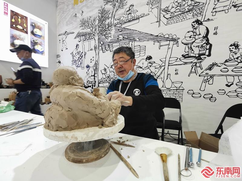 在福建展馆陶艺文化互动区,德化柴烧陶瓷匠人展示制作技艺。东南网记者 邹玒 摄
