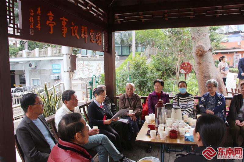 仁安社区的老党员们聚集在“党群议事亭”一起读党报上党课。(东南网记者 刘玮 摄)