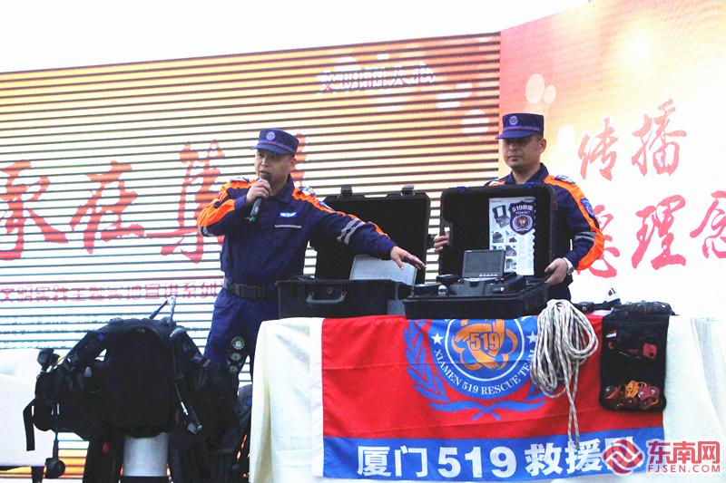 519救援队队长陈其标介绍救援装备(东南网记者 李霖 摄)
