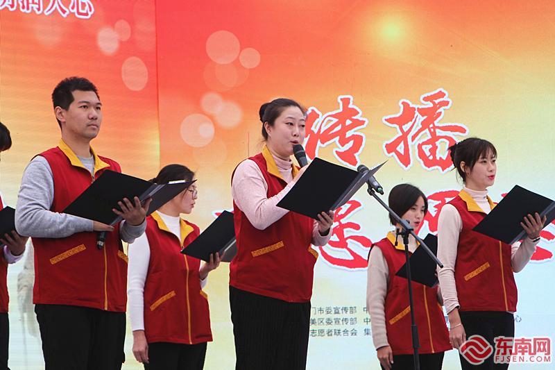 先进典型代表及星级志愿者代表上台接受表彰(东南网记者 李霖 摄) 东南网12月19日讯(本网记者 李霖 李奇 实习生 叶琰)先进典型登台接受表彰,秀出文明实践志愿服务靓丽名片;优秀志愿者讲述感人爱心故事,分享志愿服务路上甘甜辛酸;精彩节目轮番上演,十余支队伍场下用服务“打擂台”……12月18日下午,以“礼赞新时代 文明润人心——传承在集美”为主题,新时代文明实践主题实地宣讲系列活动首场落地活动在厦门市集美区杏林文体中心广场举办。 将新思想、新时尚、主流价值观送到家门口、心里头,让身边人说身边事、用百姓话说百姓事,此次活动由中共厦门市委宣传部、中共厦门市委文明办联合主办,中共集美区委宣传部、中共集美区委文明办、厦门广电集团广播中心承办,集美区志愿者联合会、集美区新时代文明实践中心协办。 亮相 志愿服务先进典型、星级志愿者接受表彰 集美是爱国华侨领袖陈嘉庚先生的故乡。一直以来,以忠公、诚毅、勤俭、创新为核心的嘉庚精神,为生活在这里的人们提供着源源不断的精神财富。 将嘉庚精神与“奉献、友爱、互助、进步”的志愿精神相融合,集美·诚毅志愿者联盟、集美区新时代文明实践中心充分发挥理论宣讲、社会宣传、教育服务、文化服务、科技与科普服务、健身体育服务、乡风文明建设等七大平台作用,培育出923支志愿服务队伍,通过爱心“110”志愿服务模式,引导57家文明实践站因地制宜组织开展近4000场爱心文明实践活动,总志愿服务时长255.5万个小时。 据悉,2020年以来,集美区共获得省“四个最美先进典型”、省志愿服务项目大赛、善心八闽公益慈善赛等市级以上奖项15个。 表彰先进,树立典型,传递爱与正能量,不久前,集美区开展了“选树2020年集美区最美新时代文明实践志愿服务先进典型”活动,评选出22名最美新时代文明实践志愿者、12个最美新时代文明实践服务组织、10个最美新时代文明实践服务项目、12个最美新时代文明实践站项目。 此外,集美区同时开展了“集美区首批百名星级志愿者”认定工作,共评选出一星志愿者60名、二星志愿者40名。 现场,先进典型代表及星级志愿者代表上台接受表彰。