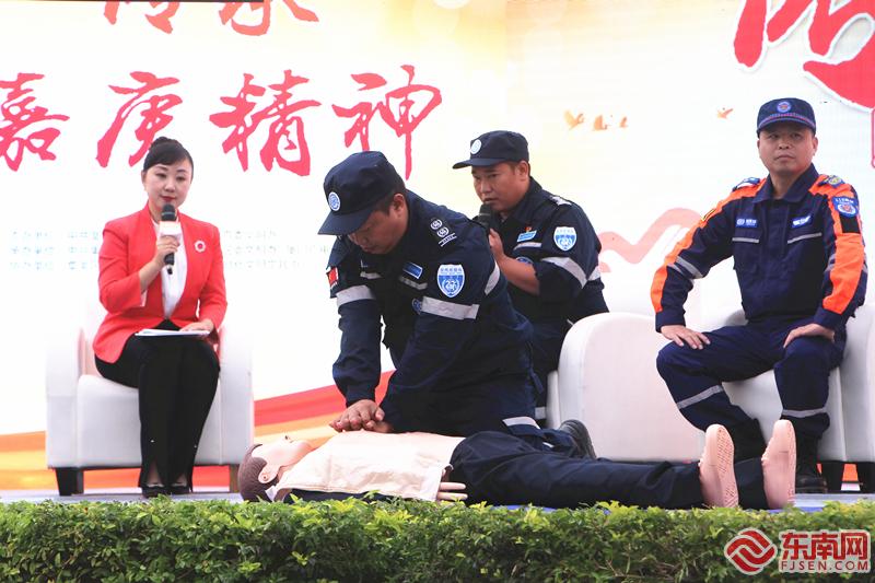 驰鹰救援队队员蒲涛现场教学心肺复苏术(东南网记者 李霖 摄)