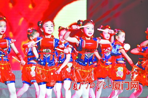 《欢乐鼓娃》表演。(本组图/记者 张江毅 摄) 喜庆热闹的《欢乐鼓娃》拉开了晚会序幕,孩子们的表演点燃了现场。来自区直机关、公安、城管、街道社区、劳模、教师、志愿者、环卫工人等各行各业代表,齐聚观看精彩演出。 “开工项目一大批,岛内提升真给力。泥窟石村湖滨片,何厝岭兜滨海片,征迁签约传捷报,改造进入快车道。好厝边,近邻里,邻里和谐都受益,公共事项齐参与,形成治理共同体……”一句句快板唱词道出了思明发展变化。一曲由10人带来的动感音乐快板《筑梦思明》,听得人心潮澎湃。 这支音乐快板用近千字内容生动描绘了思明区2020年各项事业建设发展取得的喜人成绩,热情讴歌思明人勇立时代潮头、昂首阔步向前的精神风貌。 有幸表演这一节目,演出单位利舞团团长林琳介绍说:“思明发展成就令人振奋,这是我们第一次尝试用‘快板+舞蹈’的形式表演节目,非常有意义。”作为一名舞蹈艺术从业者,她将舞蹈多元化的无限可能,结合思明各领域的变化融入到作品中,为思明发展鼓与呼。 此次演出,为思明创作的节目成为一大亮点。一个半小时的精彩演出,既为党员群众献上了一场文化视听盛宴,也是一场极具意义的精神盛宴。 由思明区文联原创的诗朗诵作品《金鸡报晓》,展示思明人锐意进取的精神风貌;由厦门老战士合唱团带来的大合唱《腾飞吧,魅力思明》,向人们倾诉思明日新月异的变化,歌声中传递着满满幸福感。 思明区音乐家协会主席杨镇是《腾飞吧,魅力思明》的作曲者,同时又担任指挥,作为活跃在思明舞台上的文艺工作者,他为思明去年来经受住考验取得的辉煌成就点赞,并借歌曲名字,期待魅力思明腾飞发展。 致敬逆行英雄 引发强烈共鸣