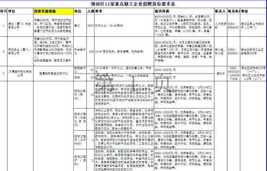 近来,通达用工紧缺,为此新阳人力资源市场本周末还将组织两次通达专场招聘会。 区人社局相关负责人:“海沧各企业开足马力生产,春节假期不停工。这次招聘会企业是主角,主要还是满足各企业的用工需求。我们也对接了各街道和村居,向人才发出招聘会邀请。区人社局在春节期间预计将为规上工业企业发放补贴100元/人/天,鼓励员工留厦。” 海沧区积极响应厦门市“留厦”倡议 数千万真金白银鼓励产业工人 留“厦”过大年! 关键上半年,重点一季度,决胜在春节! 面对企业的岁末年终用工困难 海沧区主动服务 招聘有困难,宣传来帮忙 线上线下联动,场内场外齐火 除现场招到230人之外,前两天通过线上发布信息,海沧各企业招到2700多人。海沧此次招聘会,共招到3000人! 一个都不能少! 海沧这次真的放大招了! 这是“三赢”的局面 “工人留下得实惠,企业订单抓落实,各界防疫保安全” 最近 线上一波“留厦”福利在后台炸锅 海沧君收到好多粉丝留言 询问“留厦”招聘事宜 ☟☟☟ @随缘:请问还招工不?待遇太好了!让在外的人有家的味道。 @嘿,我说:我不回家过年,留厦可以拿到这福利吗? @w:可以兼职吗? 海沧区11家重点缺工企业招聘岗位需求表 (点击查看大图)