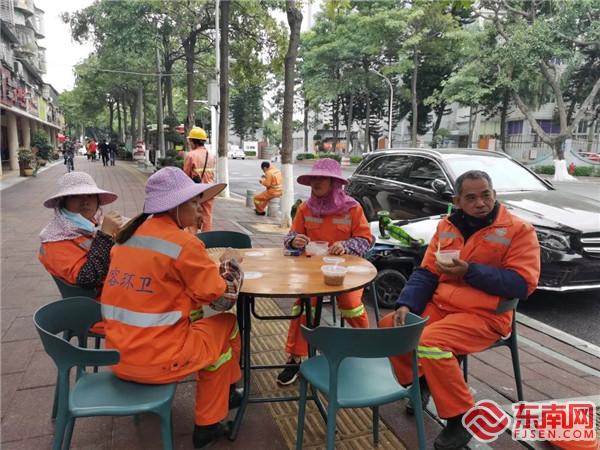 腊八粥送到了环卫工人的手中。(长乐社区供图)