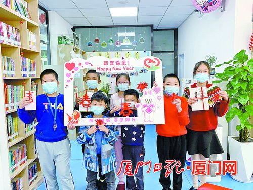 外来务工人员子女参加思明区新厦门人图书馆公益课,展示自己剪的“春”字和获赠的书籍。(记者 吴燕如 摄)