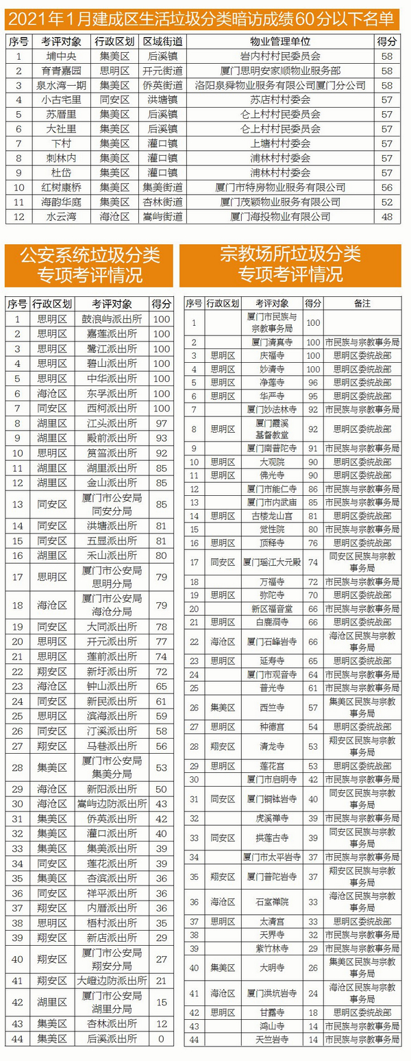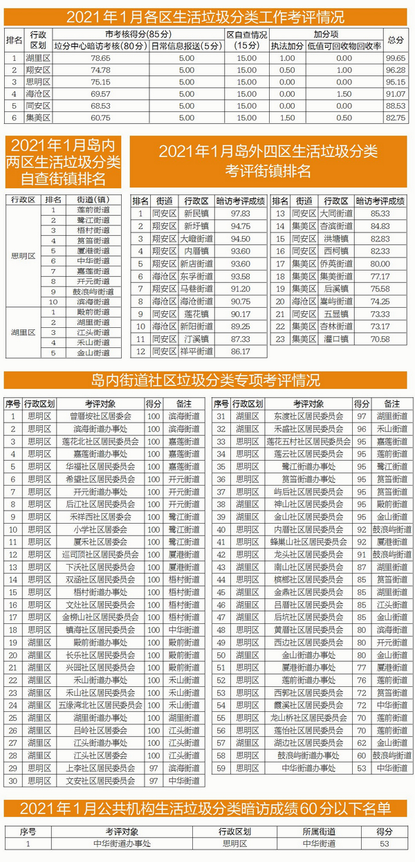 1月份垃圾分类考评成绩公布 湖里翔安排名前二 共检查632个考评点,发出考评通报44份 厦门日报讯 (记者 吴海奎)垃圾分一分,环境美十分。根据《2020年厦门市生活垃圾分类工作考评方案》,受市生活垃圾分类工作领导小组办公室委托,市垃圾分类中心于2021年1月份组织暗访考评小组对各区垃圾分类工作进行考评。考核范围包括各区建成生活区、沿街店面、生活垃圾直运接驳点、自然村、公共机构、公共场所,共检查632个考评点,发出考评通报44份。 从全市各区的排名情况来看,湖里区以99.65的总分,排名第一;翔安区以96.28分,排名第二;思明区、海沧区、同安区、集美区分列第三、四、五、六名。 市垃圾分类中心于2021年1月25日至2021年2月10日,组织暗访小组开展岛内街道社区专项考评。本次考评街道社区共59个,整体平均得分91.63分,其中,90分以上42个,60分以下1个。结合考评结果来看,共有28个街道及社区满分,有43个街道及社区在分类投放准确率方面满分;大部分街道及社区存在的主要问题是宣传引导及设施设备中分类桶标识的错误,中华街道、鼓浪屿街道及金山街道的湖边社区在准确率方面扣分较多。 市垃圾分类中心于2021年1月6日至2月9日,组织暗访小组开展公安系统专项考评。本次考评公安系统单位共44家,整体平均得分63.41分,其中,90分以上10家,60分以下20家。结合考评结果来看,鼓浪屿派出所、嘉莲派出所、鹭江派出所、碧山派出所、中华派出所、东孚派出所、西柯派出所在此次考评中都得到满分的好成绩;考评成绩较低的单位的主要问题是未设置宣传引导或设置不规范、设施设备管理不到位以及分类准确率较差,其中,检查的六区公安分局中,翔安公安分局和湖里公安分局在宣传引导及分类准确率方面未得分。 市垃圾分类中心于2020年12月28日至2021年2月5日,组织暗访小组开展宗教活动场所专项考评。本次考评宗教活动场所共44家,整体平均得分62.09分,其中,90分以上11家,60分以下19家。结合考评结果来看,厦门市民族与宗教事务局及厦门清真寺、庆福寺、妙清寺等宗教场所垃圾分类开展情况不错;其他寺庙在不同项目都有扣分情况,其中,不少寺庙在宣传引导方面扣分较为严重,主要是未设置宣传栏或宣传内容有误;分类投放准确率方面,厦门铜钵岩寺、大明寺、甘露寺、鸿山寺及天竺岩寺都存在未得分的情况。