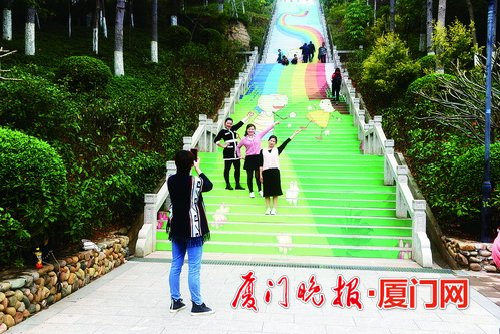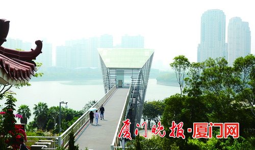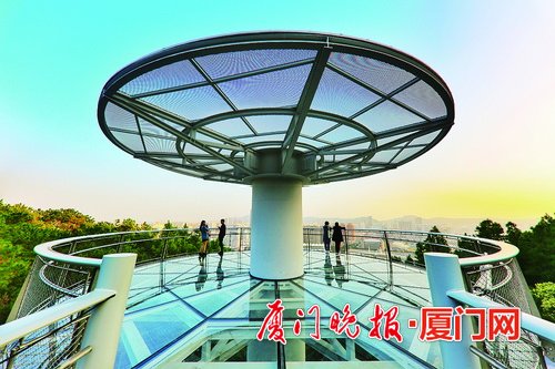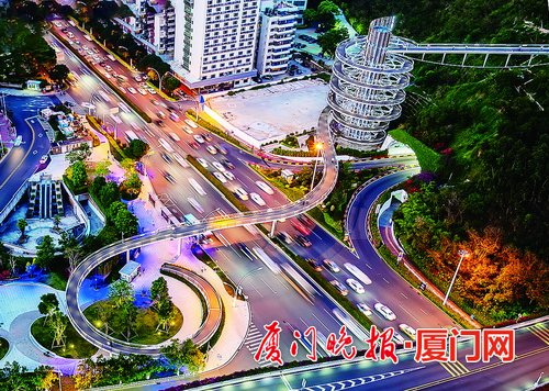 “网红大螺旋”和熙楼 陈立新摄 漫步“网红螺旋坡道”悠然园高空之上,该特色景观园由设计团队因地制宜,依据仙岳山山形修建。以微景观的设计手法打造螺旋楼梯与周边自然山体的围合空间,解决了从仙岳山至园山路段海拔落差过大的难题。 亦可在文化广场上感受紫罗兰花海的罗曼蒂克气息,打卡文化广场附近贴地路段“流光花径”。该路段还有夜光花径精彩点缀,白天只是花瓣装饰,夜晚灯光亮起时,伴随着脚边发出的彩色花朵亮光,如梦似幻。 园山桥—步道枋湖客运中心(成功大道)段 园山广场赏云海花阶 五岭桥静候列车穿越 “园山桥”造型与含有“X(厦)M(门)”元素的山海健康步道Logo组合而成的全新地标,值得前往打卡。该路线还可以感受园山广场云海花阶的美妙,现有大面积种植的超级向日葵、多色三角梅等时令花卉,四季更迭变化,形成强烈的视觉冲击。 在五岭桥上能看到呼啸而过的动车,不少摄影爱好者聚集于此,静静等待捕捉列车穿越的一瞬光影。另外,在五岭广场还可欣赏黄花风铃木的金黄璀璨。 步道枋湖客运中心(成功大道)段—虎头山公园东门 品味人间烟火的美好 打卡两座公园网红彩绘 在枋湖客运中心附近有上下步道的出入口。走上步道,穿梭于城中居民高楼间,感受平常人家美好生活氛围,打卡薛岭山公园“彩虹云梯”和虎头山公园“高山流水”网红彩绘,漫步于跨越两座公园的悬索节点金尚桥。 五缘湾湿地公园(感恩广场)—金山观湖台 穿梭于热带蔓藤花架 观湖台眺望湖边水库