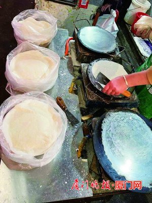 摊薄饼皮 厦门薄饼是厦门传统的地方名点,又名春卷、春饼,用面皮卷着各种菜肴,逢年过节,家家户户都会吃,清明节尤为普遍。 【数据】 薄饼皮近期热销 有摊位日售超200斤 “最近来买的人明显多了,日均销量超200斤。”在集美白泉菜市场摊薄饼皮十余年的小李说,自家的薄饼皮论斤卖,每斤15元。在店里,小李不停忙活,一手五指和掌心都沾着面糊,往加热的平底铁板上摊一圈迅速拎起,被铁板粘住的面糊便凝结成一张匀白细腻的饼皮。记者注意到,小李的动作非常利索,可以同时摊3口铁板,一分钟十几个饼皮很快成型,摊好的饼皮薄而柔韧。 |