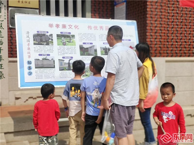 居民、小朋友参观清风园孝廉故事展板 陈小芳 摄