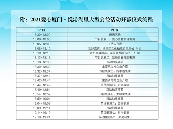 五一“黄金”周及劳动节、青年节、母亲节三节来临之际,在厦门市湖里区“爱心厦门”建设工作领导小组办公室、湖里区文化和旅游局、湖里区总工会、共青团湖里区委、湖里区妇联的指导下,开展以“爱心厦门、悦游湖里”为主题的系列文旅业界献爱心、促旅游宣传活动。 活动于2021年5月1日下午6点在厦门湖里万达广场正式拉开帷幕,由湖里区旅游协会携手会员企业为厦门市民及来厦游客做出优惠让利和爱心奉献。 5月1日至5日每天下午6点起(部分时间可能有调动),湖里万达广场1号门大舞台将现场举行爱心捐赠抽奖及表演活动,市民和游客还可以在悦游湖里小程序、云上爱心屋线上平台参与折扣让利活动。