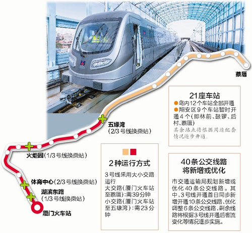 图片来源:厦门日报 厦门日报讯(记者 林钦圣)昨日上午,记者从厦门市交通运输局获悉,经市政府批准,地铁3号线(厦门火车站至蔡厝站段)定于6月25日上午10时开通运营。3号线开通运营后,厦门市轨道交通形成“中心放射、三向出岛”的格局,迎来网络化运营时代。 厦门将延长轨道交通运营服务时间 地铁3号线,起于厦门火车站,止于翔安蔡厝站,是厦门城市中心向东放射的轨道交通骨干线,构建了本岛与翔安区的快速跨海连接通道,连接思明、湖里和翔安三个区。 3号线开通后,我市将延长轨道交通运营服务时间。地铁3号线小交路(厦门火车站至五缘湾站)的末班发车时间为23:00,大交路(厦门火车站至蔡厝站)的末班车发车时间为22:30。 1、2号线末班发车时间同步调整 自3号线开通之日起,同步调整1、2号线的末班发车时间,1号线的末班发车时间由22:30延后至23:00;2号线小交路(五缘湾站至新垵站)的末班发车时间由22:30延后至23:00,大交路(五缘湾站至天竺山站)的末班发车时间仍为22:30。 除4个新增地铁换乘站外,与轨道交通换乘的BRT站点由2个增加到4个,分别是文灶站、蔡塘站、火车站、双十中学站。 |