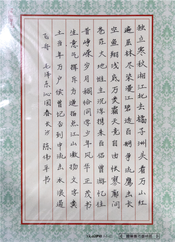 翔安区卫生和计划生育监督所 陈伟平 书 沁园春·长沙 毛泽东 独立寒秋,湘江北去,橘子洲头。看万山红遍,层林尽染;漫江碧透,百舸争流。 鹰击长空,鱼翔浅底,万类霜天竞自由。怅寥廓,问苍茫大地,谁主沉浮? 携来百侣曾游。忆往昔峥嵘岁月稠。恰同学少年,风华正茂;书生意气,挥斥方遒。 指点江山,激扬文字,粪土当年万户侯。曾记否,到中流击水,浪遏飞舟? |