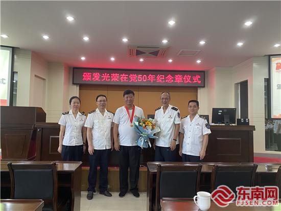 老党员杨兵(中)获颁“光荣在党50年”纪念章(厦门市卫生监督所供图)