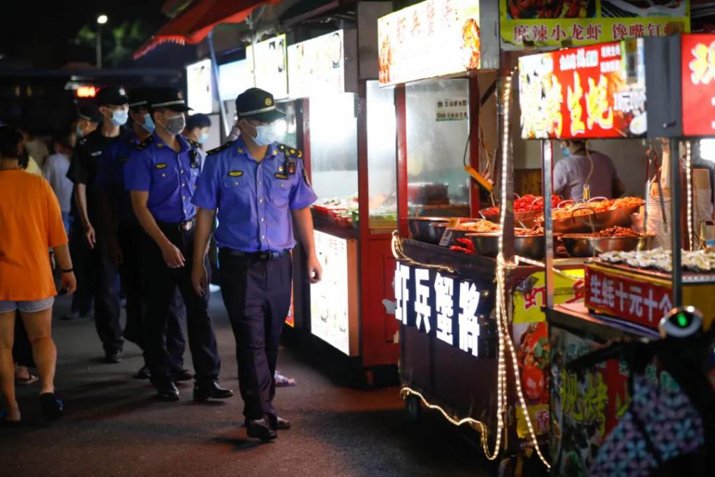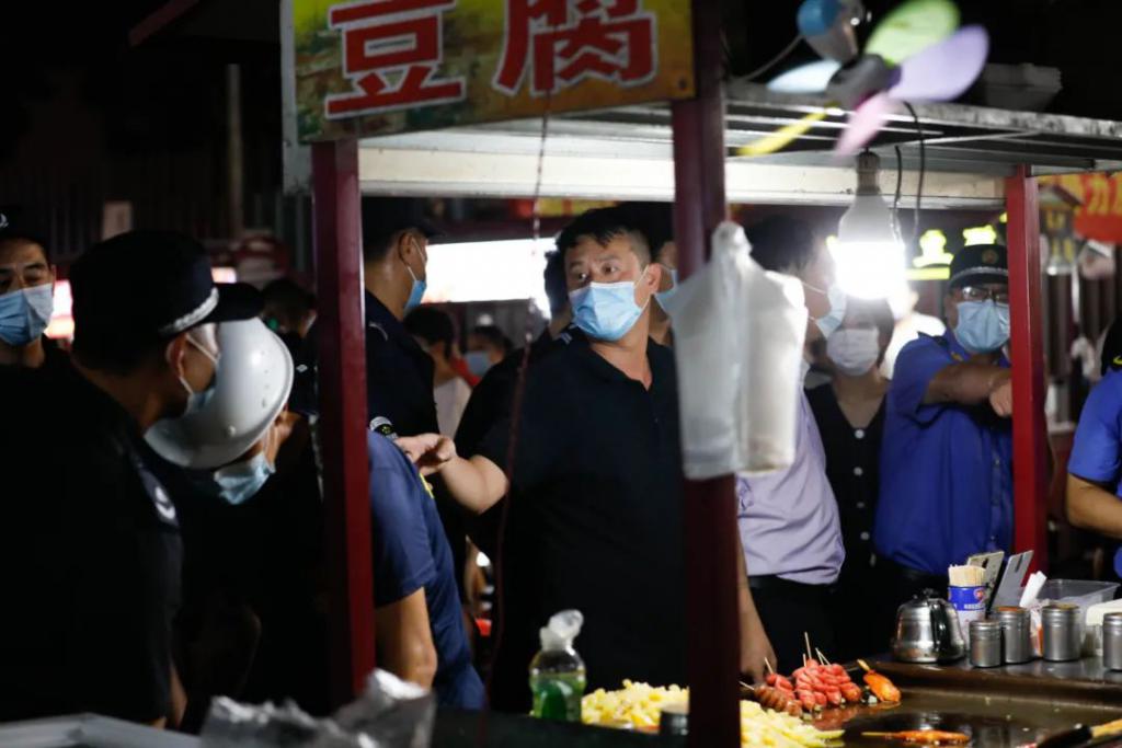 戴口罩不仅是自我防护 更是对他人负责的态度 昨晚,海沧区四个街道联合区市场监管局、区城管局等各执法部门开展专项整治,整治食品经营者不佩带口罩以及违法占道经营等。