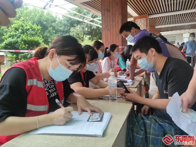 志愿者为接种居民填写表格。周卫修 摄 声音 希望能多一点理解,多一分配合 跟随着慰问团队,记者在灌口镇三社小学疫苗接种点见到了来自灌口镇文明实践志愿服务队的25名志愿者们。在等待区、登记区、预检分诊区、接种区、留观区都能看到他们忙碌的身影——测量体温,维持秩序,引导接种人员按间隔排队,指导填写执勤同意书,疏导、观察留观人群,为医务人员提供力所能及的协助…… “打完了往右边走,观察半小时。”下午四点半,顶许村居民陈金连站在接种室门外,引导接种人群前往留观区,尽管此时气温已经没有正午时那般炎热,她还是大汗淋漓,刘海被汗水打湿,一缕一缕地贴在额头上。她告诉记者,每天早上8点到晚上6点,志愿者们几乎不休息,吃饭也是轮着来,“来了就不怕累,希望居民多一点理解,多一点配合。” “我们的志愿者基本上都是很灵活机动的,哪里有需要就往哪里跑。我每天都在小小的三社小学里,但是一天下来微信步数都超过2万。”灌口镇新时代文明实践志愿服务队负责人周卫修告诉记者,8月4日他创建了灌口镇疫情防控志愿者群,短短几天已经达到120人。每天疫情防控志愿服务任务一经发布,志愿者们就迅速在群里接龙报名,还积极地普及疫情防控知识,分享志愿服务经验。 实际上,无论是集美区各个疫苗接种点,还是车站、商场、广场等公共场所,都不难看到志愿者的身影,他们身着红马甲,穿梭在人群中,为疫情防控贡献出自己的一份力量。 戴劲竺表示,三级应急响应启动以来,集美区充分发挥新时代文明实践中心、集美·诚毅志愿者联盟的平台优势,以文明实践所、站,各志愿服务队为基点,积极组织志愿者开展疫情防控志愿服务工作。志愿者们以实际行动弘扬“奉献、友爱、互助、进步”的志愿精神,在服务岗位上闪闪发光,保卫人民群众健康,全力以赴共筑防疫长城。