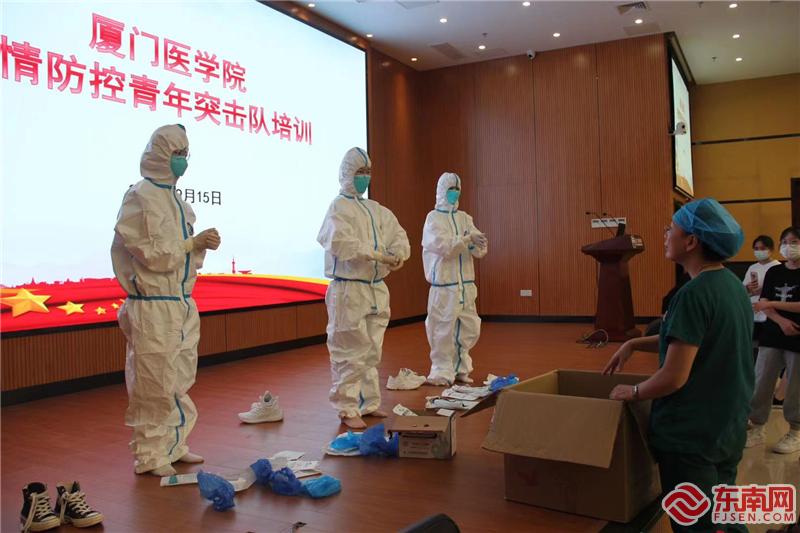 突击队队员现场实操防护服穿脱(厦门医学院供图)