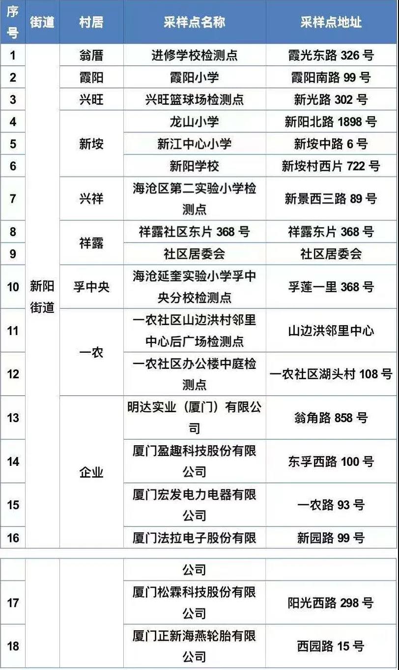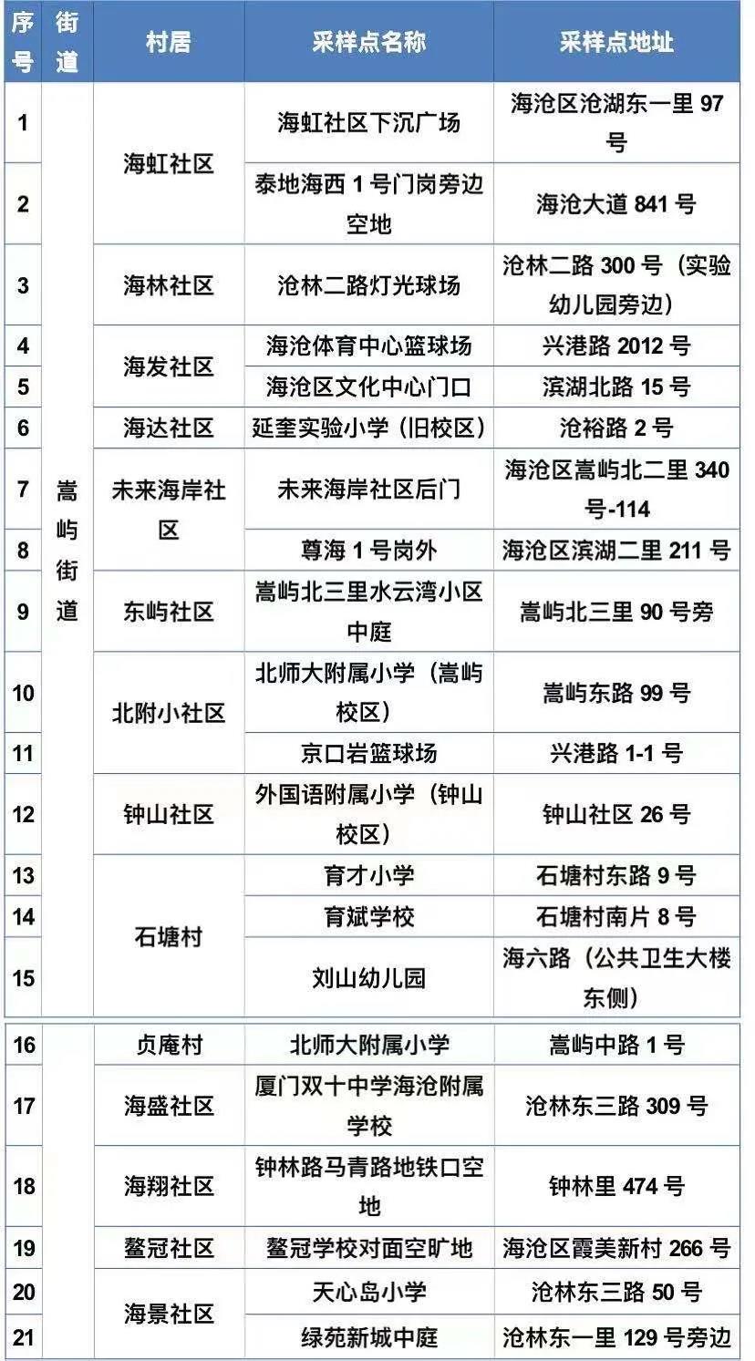东南网9月17日讯(本网记者 卢超颖)17日晚,厦门市海沧区应对新冠肺炎疫情工作指挥部发布【2021】第6号通告。根据厦门市应对疫情工作指挥部统一部署,为及时有效发现和控制传染源,阻断疫情传播,决定2021年9月18日(周六)7:00开始开展海沧区第二轮全员新冠病毒核酸检测。 有关事项通告如下: 此次核酸检测的区域范围划定为海沧区行政区域全域,在该区域内工作、生活的人群均需开展核酸检测。核酸检测时间安排为: 2021年9月18日(周六) 嵩屿街道片区、新阳街道片区 2021年9月19日(周日) 海沧街道片区、东孚街道片区 请全体人员严格按照片区时间安排,并根据社区(村)、企业通知的时段,有序参加核酸检测,自觉做到不扎堆、不聚集。参加检测时,携带本人有效身份证件,及时前往采样点进行核酸检测。对于行动不便人员,社区(村)可以组织上门采样,确保全员覆盖、不漏一人。 开展全员核酸检测有利于实现“早预防、早发现、早报告、早隔离、早治疗”的防控目标,请广大群众听从街道、社区(村)、企业统一安排,主动接受采样,有序排队参加检测,做到应检尽检、不漏一人,共同守卫生命健康、守护家园平安。 凡应检未检,造成疫情传播的应承担相应法律责任。 核酸检测期间,请全体人员务必做好个人防护,保持一米线距离,严格规范佩戴口罩,自觉接受体温检测,提前做好预约登记。 嵩屿街道采样点安排表