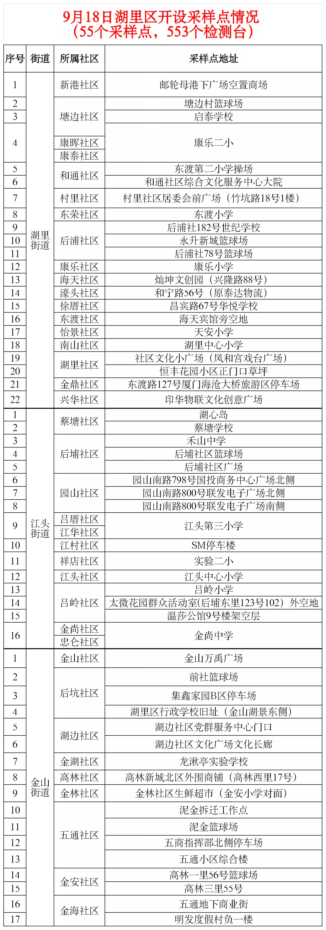 9月19日(周日)殿前街道、禾山街道所有社区将开展核酸检测,具体点位安排请关注“湖里头条”后续推文!