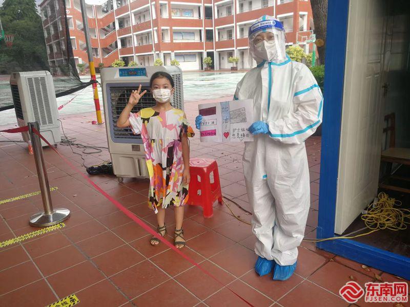 9月17日下午,在厦门市同安区第一实验小学双溪校区核酸检测点担任志愿者的李静怡收到了本年度最暖心、最珍贵的礼物——大同中心小学陈茹燕小朋友亲手绘制的手抄报。