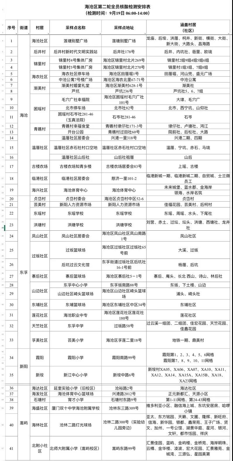 2021年9月19日(周日)6:00—14:00继续开展海沧区第二轮全员新冠病毒核酸检测。