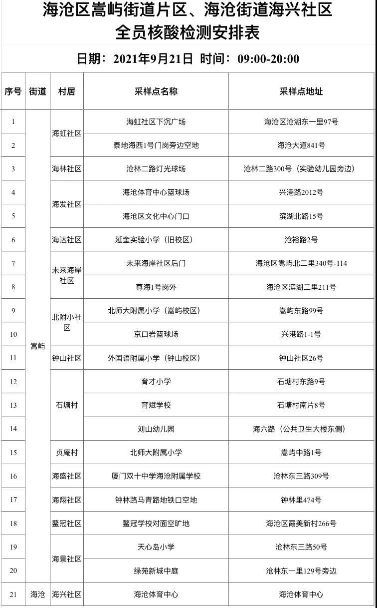 东南网9月20日讯(本网记者 卢超颖)20日晚,厦门市海沧区应对新冠肺炎疫情工作指挥部发布〔2021〕第17号通告。根据厦门市应对疫情工作指挥部最新要求,结合海沧区疫情防控形势需要,现对厦门市海沧区应对新冠肺炎疫情工作指挥部〔2021〕第16号通告有关内容作出调整如下: 一、鉴于目前海沧区确诊病例主要活动场所集中在嵩屿街道,为集中医疗资源和力量,精准高效发现和控制传染源,原定于9月21日开展的全域全员核酸检测调整为局部区域全员核酸检测。 调整后的检测范围为:嵩屿街道行政区域、海沧街道海兴社区。在该区域内工作、生活的全体人员均需开展核酸检测。 二、调整后的检测时间不变,为09:00--20:00。 请嵩屿街道行政区域、海沧街道海兴社区全体人员严格按照时间安排,并根据社区(村)、企业通知的时段,携带本人有效身份证件,及时前往采样点进行核酸检测。对于行动不便人员,社区(村)可以组织上门采样,确保全员覆盖、不漏一人。 凡应检未检,造成疫情传播的应承担相应法律责任。 核酸检测期间,请全体人员务必做好个人防护,保持一米线距离,严格规范佩戴口罩,自觉接受体温检测,提前做好预约登记。 三、海沧其他区域人员的全员核酸检测工作安排另行通知,因检测计划调整给您造成的不便敬请谅解。
