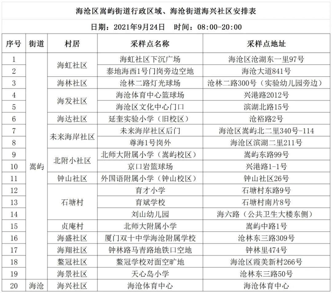 东南网9月23日讯(本网记者 卢超颖)23日,厦门市海沧区应对新冠肺炎疫情工作指挥部发布【2021】第20号通告。为及时有效发现和控制传染源,坚决阻断疫情扩散蔓延,决定于2021年9月24日08:00-20:00开展海沧区重点区域全员新冠病毒核酸检测。 此次检测划定的范围为:嵩屿街道行政区域、海沧街道海兴社区。在该区域内工作、生活的全体人员均需开展核酸检测。 请嵩屿街道行政区域、海沧街道海兴社区全体人员严格按照时间安排,并根据社区(村)、企业通知的时段,携带本人有效身份证件,及时前往采样点进行核酸检测。对于行动不便人员,社区(村)可以组织上门采样,确保全员覆盖、不漏一人。 凡应检未检,造成疫情传播的应承担相应法律责任。 核酸检测期间,请全体人员务必做好个人防护,保持一米线距离,严格规范佩戴口罩,自觉接受体温检测,提前做好预约登记。