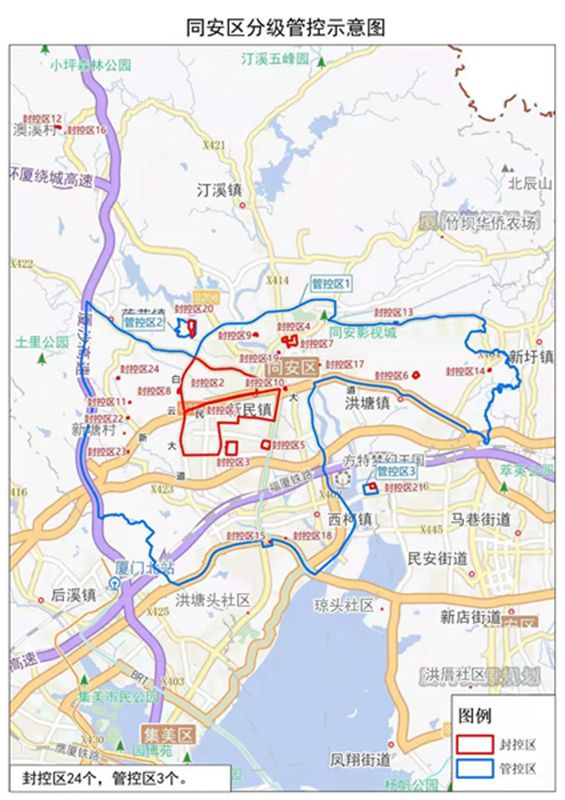 东南网9月25日讯(本网记者 文洁)25日,厦门市同安区应对新冠肺炎疫情工作指挥部发布第23号通告。为做好疫情防控工作,防止疫情扩散蔓延,切实保障人民群众生命安全和身体健康,同安区将按照“分区分级、精准防控”原则,落实更加严格的防控措施。 新增划定封控区19、20、21、22、23、24共6个(具体见附图),实行“区域封闭,足不出户,服务上门”。 新增划定管控区2、3共2个(具体见附图),实行“非必要不出门,严禁聚集”。 防控区域的类别、范围、管理时间将根据疫情防控情况实行动态调整。 |