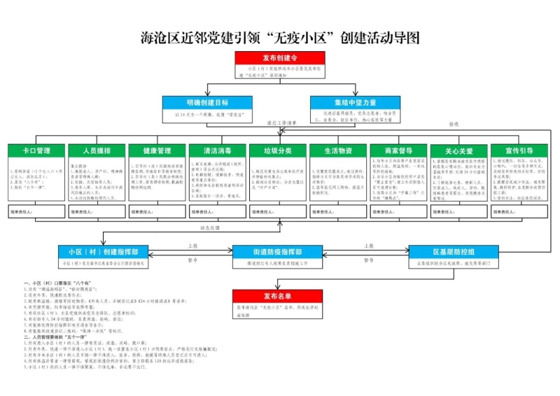 什么是无疫小区? “无疫小区”是指以14天为一个周期,实现无一例新冠肺炎确诊病例、无症状感染者、应隔离的密切接触者的疫情“零发生”小区。 相关要求 海沧区创建“无疫小区”五步工作法 第一步:发布(发布创建令)。由小区(村)党组织向广大村(居)民发布“无疫小区”的创建通知,启动创建工作。 第二步:集结(集结中坚力量)。统筹物业、业主委员会、网格员、楼栋长、志愿者等多方力量,形成“无疫小区”工作队。 第三步:派单(派出工作清单)。工作清单涵盖卡口管理、人员摸排等9类25项内容,明确以党支部委员、党员骨干等为主体的领单责任人,牵头落实清单内容。 第四步:反馈(动态反馈情况)。形成各领单责任人报告、小区(村)创建指挥部汇总、街道督促点评的三级联动推进机制。 第五步:验收(检查验收成果)。根据街道上报情况,区基层防控组进行验收,发布“无疫小区”名单。