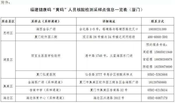 东南网9月27日讯(本网记者 邹玒)27日,厦门市应对新冠肺炎疫情工作指挥部发布2021年第20号通告,决定为健康码“黄码”人员开辟核酸检测专门通道,首次开辟时间为9月27日至9月29日。 通告中表示,除同安区人员,封控区、管控区人员,集中隔离、居家隔离等医学观察期未满人员以外,其他在厦健康码为“黄码”的人员,以及接到厦门市疫情防控指挥部短信通知的人员,应当到“黄码”专门通道参加检测。 参加专门通道检测须凭健康码“黄码”或厦门市疫情防控指挥部短信通知。上述人员应参加两次专门通道核酸检测,且两次采样须间隔24小时以上,如检测结果均为阴性,经审核可转为“绿码”;厦门市疫情防控指挥部短信通知另有要求的,按通知要求执行。 健康码“黄码”人员凭本人身份证(户口本)向所在村(居)或小区登记报备后外出参加专门通道核酸检测,村(居)或小区应为其返回提供便利。 凡应检未检造成疫情传播的,依法追究责任。认为被赋健康码“黄码”不准确的人员,可通过“i厦门”公众号、厦门12345公众号“健康码‘黄码’诉求提交栏目”提交材料申请调整,如有疑问,请咨询0592-12345。 本次专门通道开放时间为每日9:00-12:00、14:00-20:00,如有调整详见“i厦门”公众号疫情防控专区《福建健康码黄码人员核酸检测采样点信息一览表(厦门)》。今后开放专门通道时间将另行通知。专门通道未开放时,上述人员可自行前往相关医疗机构自费进行核酸检测。