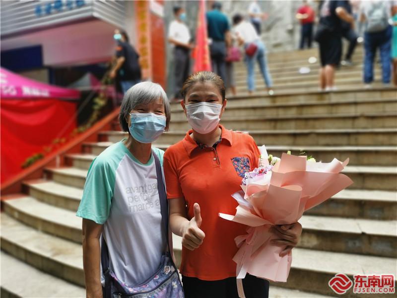 小区居民送上鲜花,庆祝小区解封。(东南网记者 卢超颖 摄)