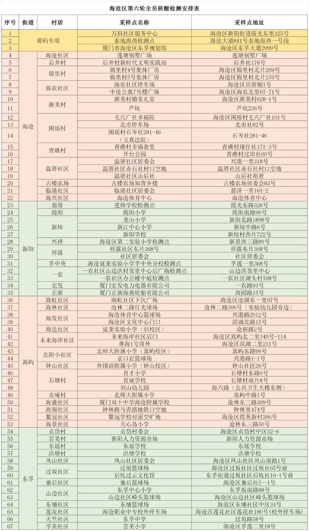 厦门海沧公布采样点 明日将开展第六轮全员核酸检测