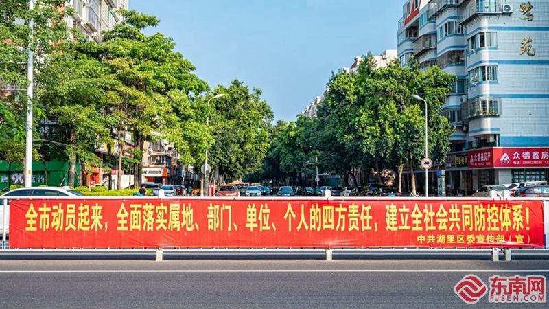 疫情防护的横幅提醒广大市民,在感受假期欢乐的同时也别忘了继续做好疫情防护。(湖里区融媒体中心供图) “庆祝国庆 同心抗疫”等标语,也提醒广大市民,在感受假期欢乐的同时也别忘了继续做好疫情防护,非必要不外出,让所有人都能安安全全、快快乐乐地欢度佳节。