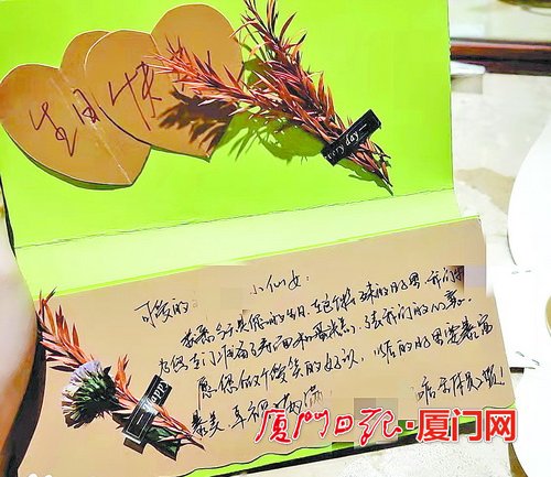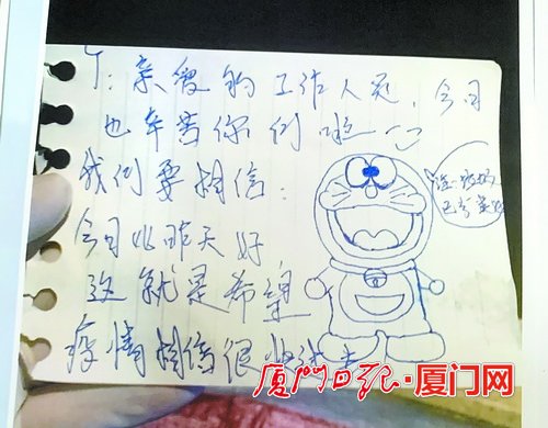 专班工作组和酒店为过生日的隔离人员手工制作生日贺卡,尽显满满诚意。 厦门日报讯(记者 吴燕如 通讯员 夏思萱 图/隔离酒店专班工作组提供)“小叶,今天是你的生日,工作组和酒店人员为你送上一份生日礼物。祝你笑口常开,心想事成!” “谢谢,你们的祝福我收到啦。我送给你们一张‘大白’速写画,你们辛苦了!” 2日晚上,一段特别的对话出现在位于莲前西路的思明区一家隔离酒店的房门口。隔离人员与“大白”温馨互动、互送礼物,传递双向温暖。 隔离不隔爱,贴心暖人心。思明区某隔离酒店专班工作组以酒店为家,将“无忧驿站”创建行动转化为贴心举措、暖心服务,全力保障“家”中的每一个人,让隔离人员更安心隔离、更舒心生活,在战疫中传递厦门温度、思明大爱,为打赢疫情防控歼灭战贡献力量。 故事1 26岁热心女生: “隔离期间我帮不上忙,手写小纸条为大家加油打气” 一碗寿面加了两个蛋、一份精致蛋糕搭配水果和糖果、一张手工制作的生日贺卡写满祝福语——当小叶打开生日礼物袋子后,不禁流下感动的泪水。 “没想到自己的26周岁生日是在隔离酒店度过的,但是这个生日是我最难忘的。大家为我考虑得太周到了。”在电话采访中,小叶言语中充满感激之情。 生日贺卡上有一段真挚的“告白”:“虽没见过面,但看到了你递出来的小纸条,被你的正能量激励到了!愿你在未来顺顺利利,愿所有美好如期而至,愿一切喜乐平安!” 这段话所说的“小纸条”,藏着小叶与工作人员无声胜有声的默契互动。小叶入住酒店的时间是9月23日晚。24日上午,当她第一次将生活垃圾放到房间门口时,特别附上一张手写的小纸条,上面写着:“亲爱的工作人员,今天辛苦你们啦!我们要相信,今天比昨天好,这就是希望。相信疫情很快会过去!”除了文字,纸条上还有手绘的机器猫插画,并注明“垃圾已分类”。 这一天,小叶收到了一封“回信”:“辛丑鹭岛,疫云压城;防疫要求,你我相聚;隔离病毒,不隔离爱……”这是工作组和酒店精心为所有隔离人员写的一首小诗,以此开启工作人员与隔离人员的情感交流。从那以后,小叶几乎每餐都会写张纸条感谢工作人员,还会画上可爱的卡通形象。生日当天,她送给大家一张“大白”速写画,花了2个多小时才完成。小叶说:“工作人员就像家人一样,隔离期间我帮不上忙,手写小纸条为大家加油打气。” 记者了解到,隔离期间,工作组和酒店人员为8名过生日的隔离人员送上精致生日餐,手工制作的生日贺卡更是不重样。隔离人员也纷纷发出感恩小视频和感谢信,让隔离酒店充满温情。 |